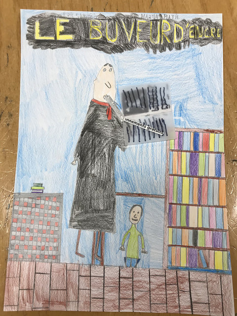 La maîtresse nous a présenté un livre très très spécial. C’est l’histoire d’un petit garçon qui déteste les livres mais son père est libraire ! Un jour, il observe une personne très bizarre qui flotte à dix centimètres su sol comme un fantôme. Le petit, caché dans sa cachette, voit l’homme prendre un livre et …